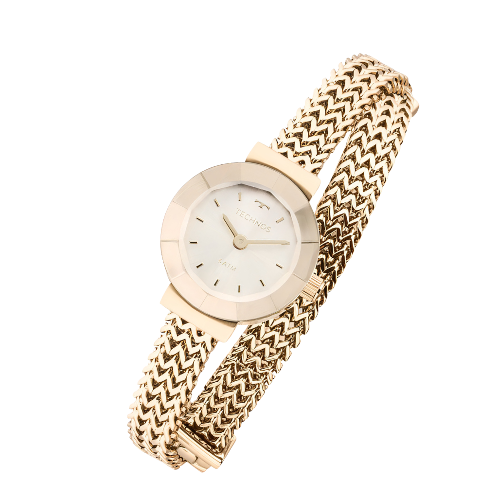 Relógio Technos Elegance mini dourado, com caixa aro dourado facetado e pulseira de aço de duas voltas. Este modelo é ideal para adultos que buscam um acessório sofisticado e versátil. Com um design redondo e elegante, o relógio apresenta uma tela analógica que destaca a cor dourada, tornando-se uma peça chave em qualquer look. Sua resistência à água é de até 50 metros, garantindo durabilidade e funcionalidade. O relógio não possui recursos como alarme, cronógrafo ou retroiluminação, focando na simplicidade e na elegância. Perfeito para ser usado sozinho como uma joia ou combinado com várias pulseiras para um estilo mais despojado, é uma escolha ideal para diversas ocasiões.